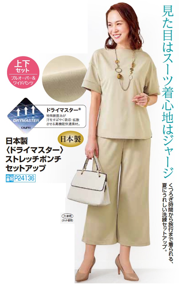 セットアップ レディース ベージュ 上下セット スーツ 日本製 ドライマスター ストレッチポンチセットアップ ツーピース 半袖 婦人服 ミセス シニア 女性 プルオーバー パンツ クロップド丈 ワイドパンツ ファッション 40代 50代 60代 70代 80代 お母さん 春夏 fri p24136
