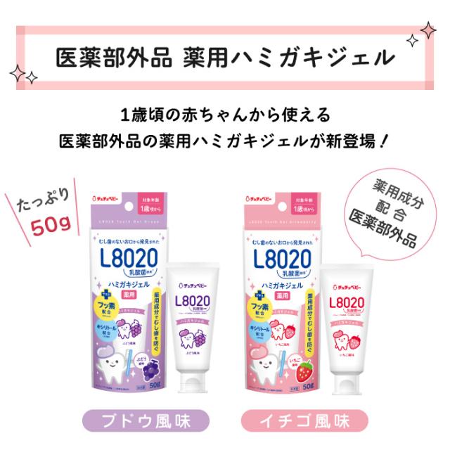 | いちご風味:薬用チュチュハミガキジェルS ぶどう風味:薬用チュチュハミガキジェルG |
