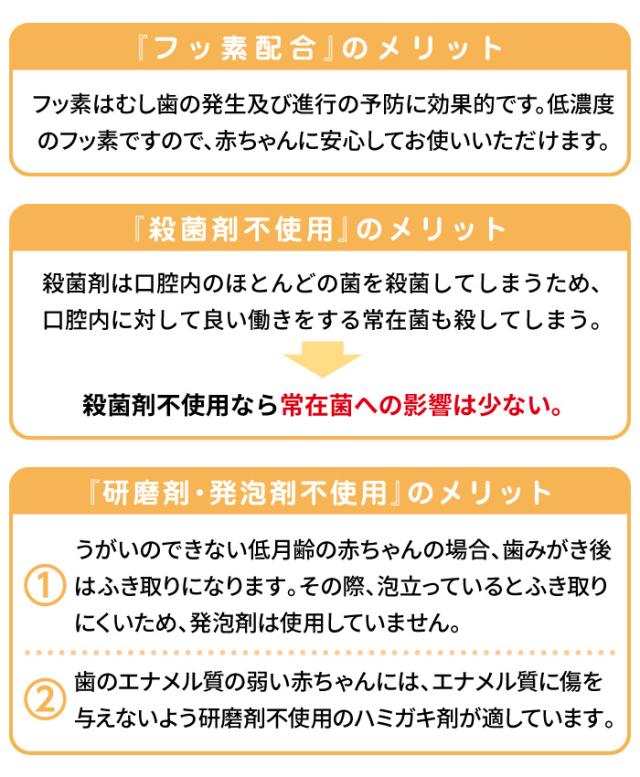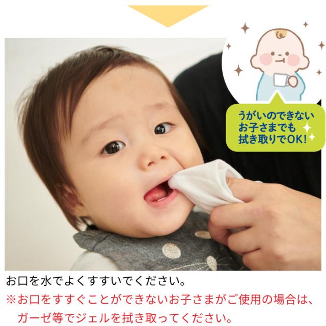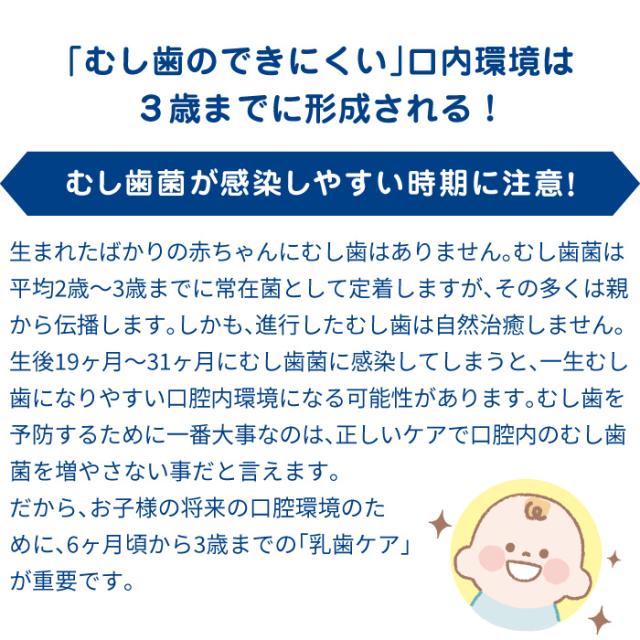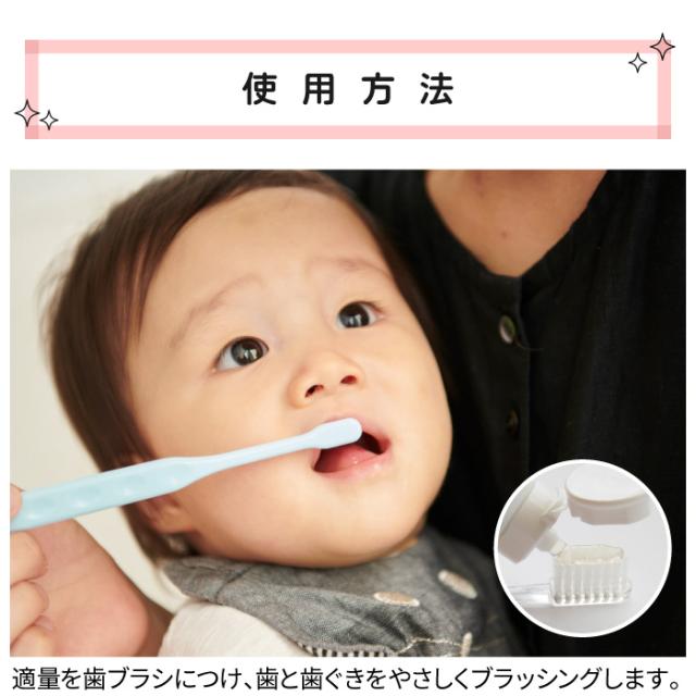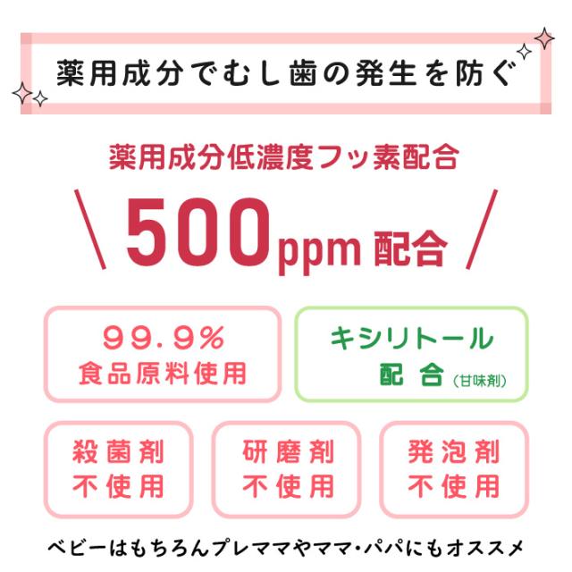 | 99.9%食品原料使用で安心! 薬用成分でむし歯を防ぐ フッ素配合(500ppm)、キシリトール配合(甘味剤) 歯の表面を傷つけにくく、うがいのできない赤ちゃんにも使える処方と、配合成分にこだわった薬用ハミガキジェル。 ベビーはもちろんプレママやママ・パパにもオススメです。 「むし歯のできにくい」口内環境は3歳までに形成される! 生まれたばかりの赤ちゃんにむし歯はありません。むし歯菌は平均2歳〜3歳までに常在菌として定着しますが、その多くは親から伝播します。 しかも、進行したむし歯は自然治癒しません。生後19ヶ月〜31ヶ月にむし歯菌に感染してしまうと、一生むし歯になりやすい口腔内環境になる可能性があります。むし歯を予防するために一番大事なのは、正しいケアで口腔内のむし歯菌を増やさない事だと言えます。 だから、お子様の将来の口腔環境のために、6ヶ月頃から3歳までの「乳歯ケア」が重要です。 《商品特長》 ●むし歯のないお口から発見されたL8020乳酸菌※1使用。 ●1歳頃からご使用できます。 ●フッ素(500ppm)配合。有効成分でむし歯の発生を防ぎます。 ●キシリトール配合(甘味剤)。 ●殺菌用不使用。 ●研磨剤不使用。 ●発泡剤不使用のジェルタイプ。うがいのできないお子さまでもふき取りでOK。 ●食品原料99.9%。フッ素以外は食品原料でできています。 ●お子さまが大好きなぶどう・いちご風昧で歯みがきタイムをサポート! ●医薬部外品 ●日本製 ●50g ●ぶどう風昧/いちご風昧 ※1ラムノーザス乳酸菌/コメ発酵末(矯味剤) |