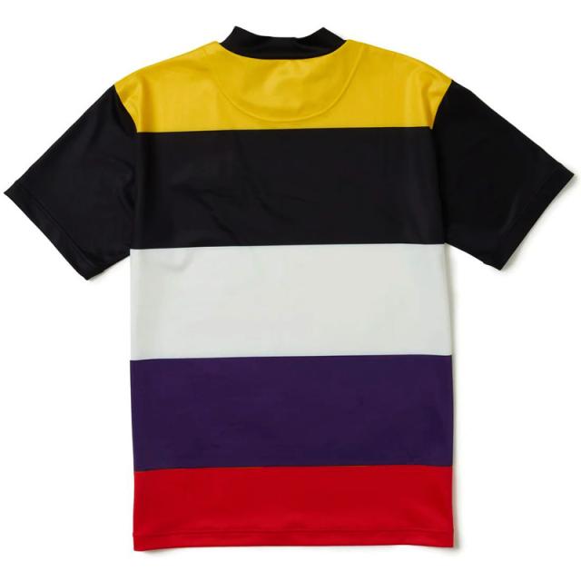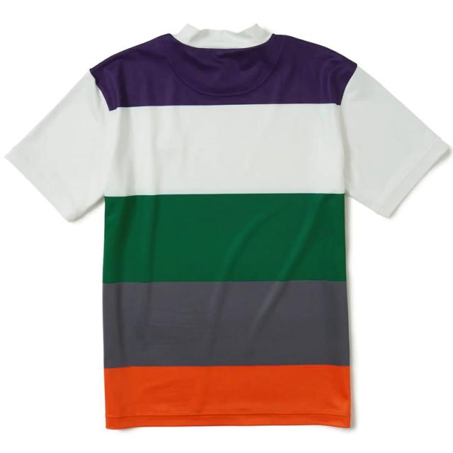 大胆な配色のやや太めなボーダーが特徴のモックネック半袖シャツ。