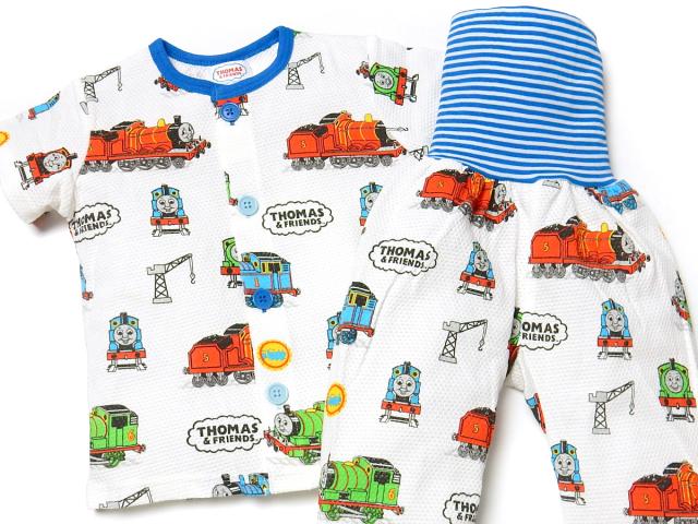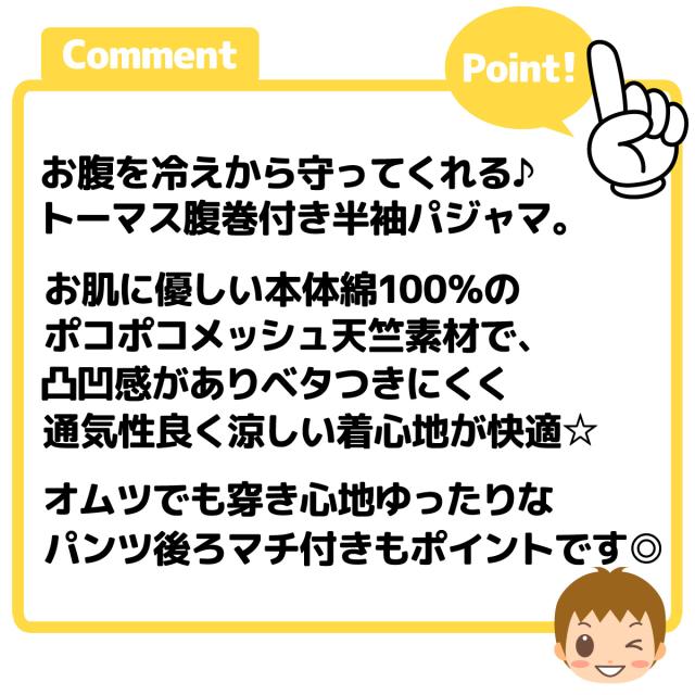 【送料無料】男児 ベビー 腹巻き付き 半袖 パジャマ きかんしゃトーマス 前開き 本体綿100% メッシュ天竺 iw-0831【メール便対応】