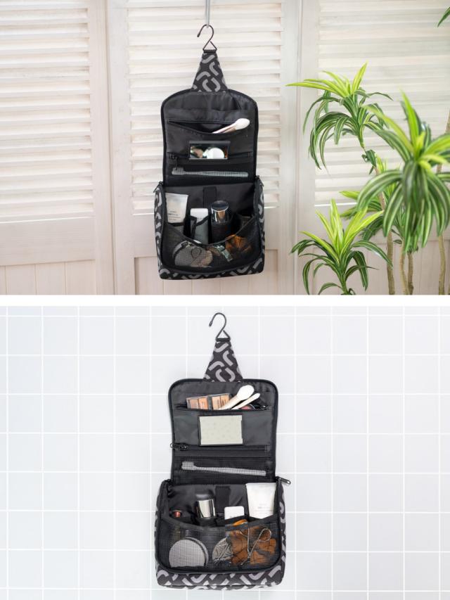 ポーチにはフックが付いているので、バスルームや洗面所に吊り下げてお使いいただけます。ポーチを広げるとドレッサーのように使えるので、身だしなみを整える際に便利です。