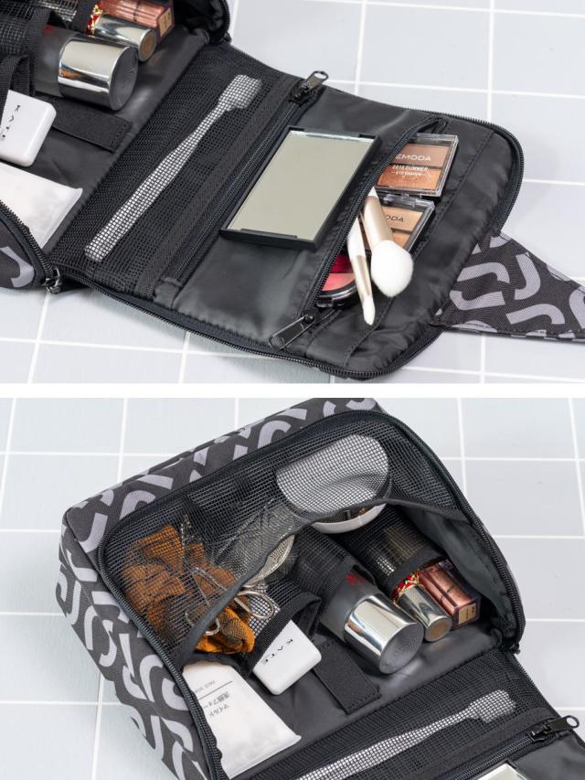 大型オープンポケット1個、大型メッシュポケット1個、メッシュボトルホルダー4個、ジッパー式ポケット2個、ブラシ留めゴムベルトと様々な収納ポケットが付いています。スキンケア、ヘアケア用品や歯ブラシなど、化粧品から洗面用品まで1つのポーチにまとめて収納できます。