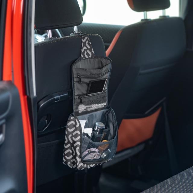 車内のヘッドレストのポール部分に引っ掛ければ、車での旅行や車中泊でも場所を取らずに楽に身支度ができます。