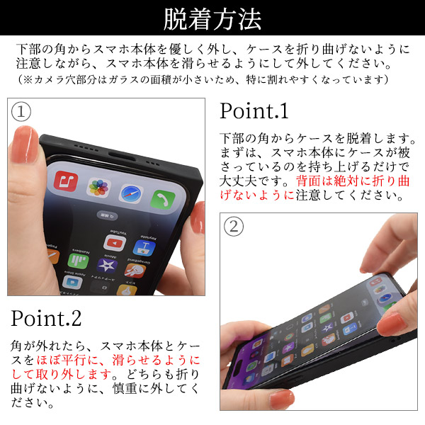 ※カメラ穴付近はガラスの面積が小さい分、特に割れやすいので、負荷を掛けないように慎重に取り外してください