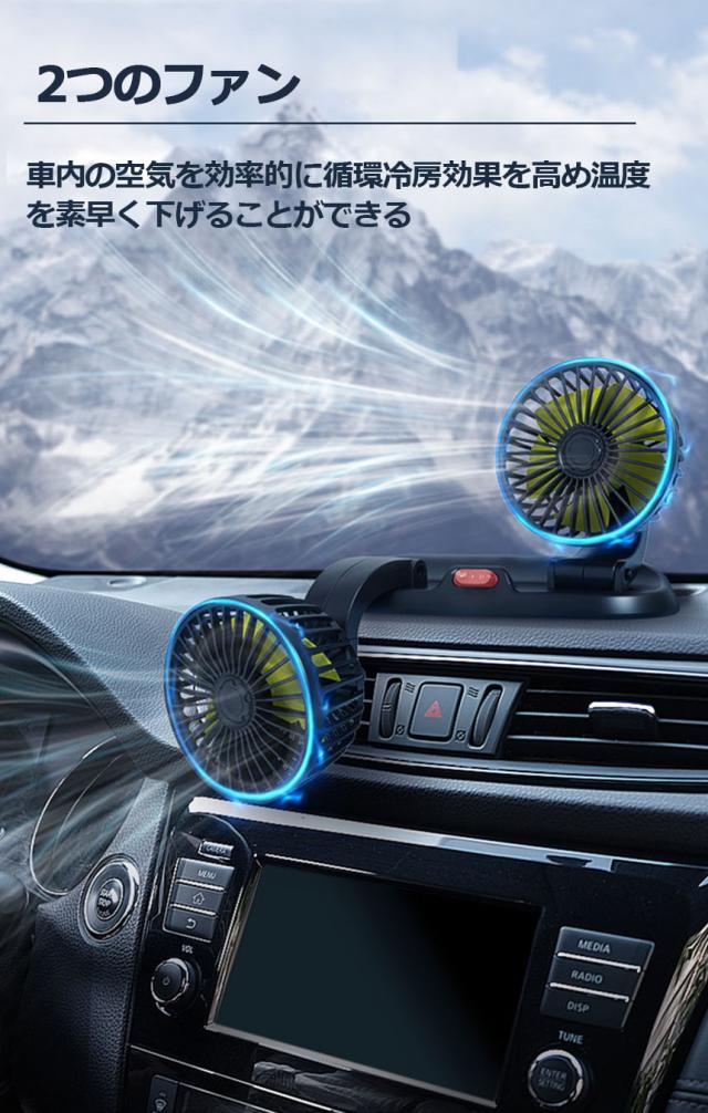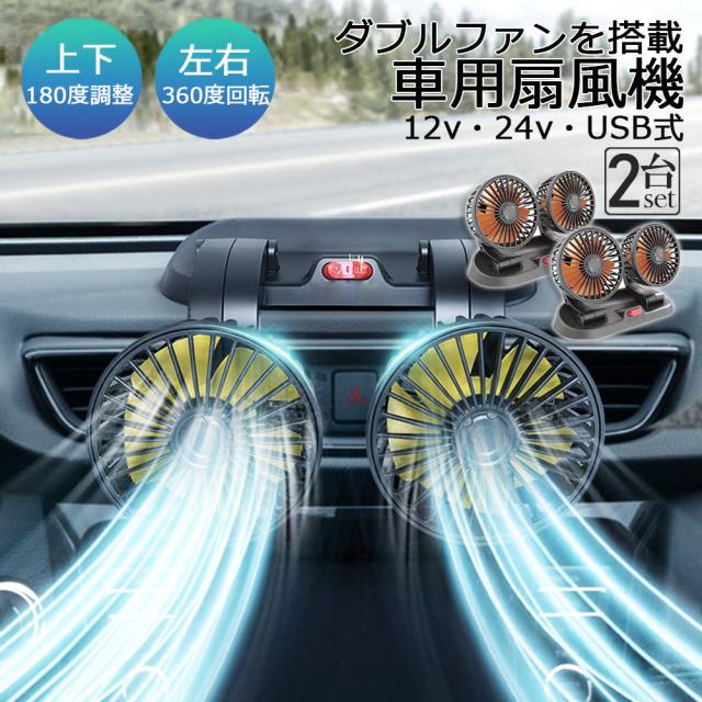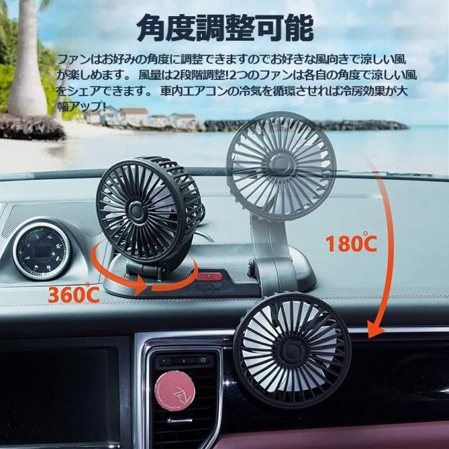 扇風機 車載扇風機 車用扇風機 車用 360度回転 2台セット 5枚羽根 USB 12v/24v仕様 ダブルフ 熱対策 電動ファン 低騒音 風速風量調節可能 小型扇風機 車内 シガー 循環 省エネ暑さ対策 車中泊 蒸れる 暑い 汗 涼しい ファン シガーソ