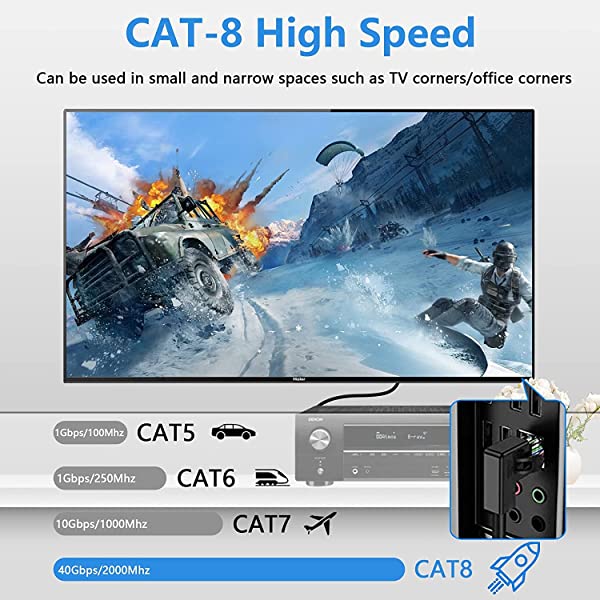 【優れた耐干渉性】:Cat8はイーサネットケーブルは4本シールド箔ダブルケーブル(STP)と単線(32AWG)から構成され、Cat8をシールドし、ダブルケーブルの撚り質を高め、Cat8はあらゆる信号干渉を最小限に抑えます。 HDビデオ、音楽、ネット、ゲームプレイをすべて再生します。