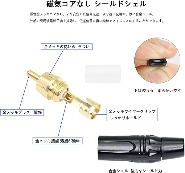 高強度アロイブラックペイントシェル、内側のコアは溶接しやすく、接続はしっかりしており、プラグの全体的な調整は正確で信頼性が高く、外部高周波電磁干渉を排除できます、送信信号をより純粋でノイズのないものにします。ビデオケーブル、オーディオケーブル、スピーカーケーブルなどに最適です。