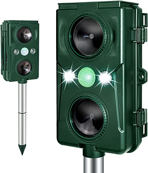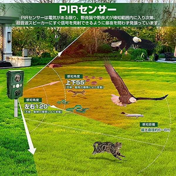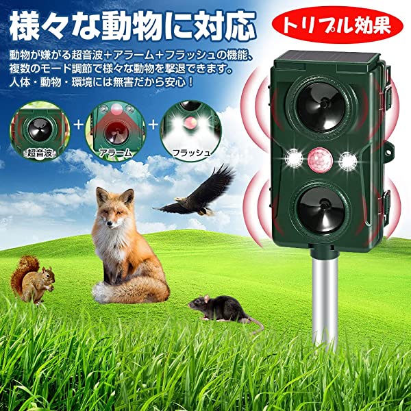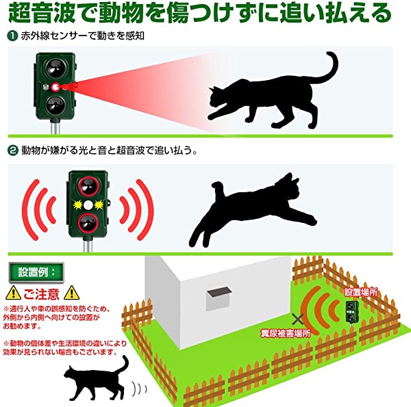 動物撃退器は赤外線センサーで動物を感知したら、化学物質を使用せずに超声波+警報アラームとLEDフラッシュで、猫、犬 、ネズミ、キツネなど動物を傷つけずに追い払う装置です。