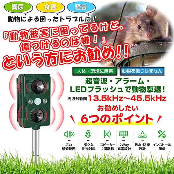 【超音波で動物を撃退】超音波周波数範囲は13.5KHzから45.5KHzまでで、動物によって嫌いな周波数の音域が異なるため、動物撃退器から出る周波数の幅を変えることで、より多種類の動物を撃退できることになります。ネズミ、モグラ、ドブネズミ、犬、猫、コウモリ、鳥、キツネ、アライグマ、ノイシシ、イタチなどの動物が撃退できます。1-2週間ぐらいで動物の糞尿や足跡、食害、騒音などの悩みから解放されます。