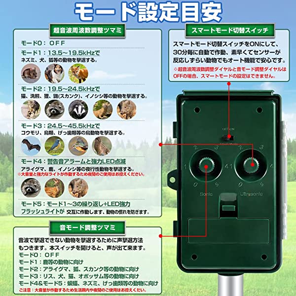 【広範囲検知・5階段の周波数調節】検知範囲は左右120°/上下55°、最大距離6〜8m以内の動物を検出できます。検出範囲に動物が入れば、自動的に超音波を出すことて動物を追い払います。超音波の周波数と作動モードは5モード調節でき、目的の害獣が嫌がる周波数の設定次第で幅広い害虫・害獣に対応できる動物撃退