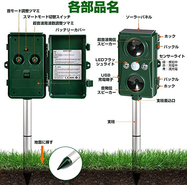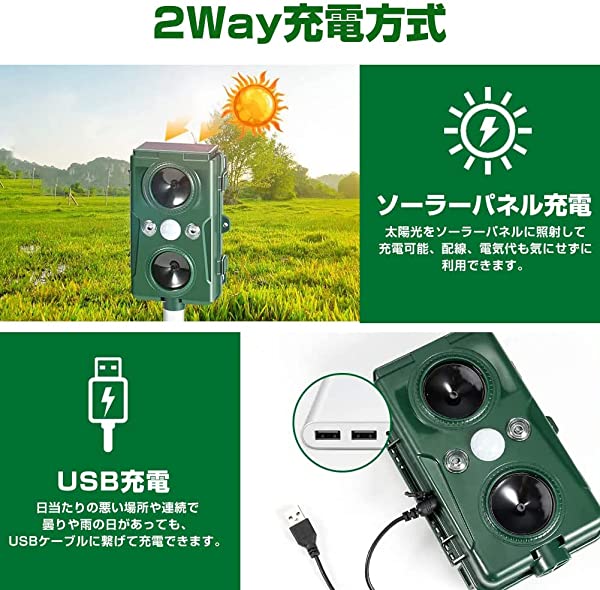動物撃退器 1個のみ 感知範囲6〜8m 超音波 害鳥対策 害獣対策 ソーラー充電 USB充電 PIRセンサー IPX4防水 害獣撃退器 糞被害対策 動物除け 猫よけ 鳥獣対策 防水 5段階モード 光 威嚇 赤外線センサー 二つ超音波スピーカー アウトドア