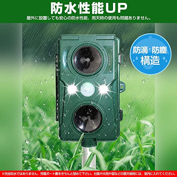 【人体動物環境に無害】動物を怖がらせる強い超音波や強力なLEDの点滅、嫌な音で、動物がPIRセンサーの範囲にいると不快に感じ、動物を傷つけずに追い払うことができます。人と動物に無害ですが、室外に置くことをおすすめいたします。また防犯用品として利用可能、音・ライトで不審者を驚かせる。キャンプ場での獣害対策にも利用可能。