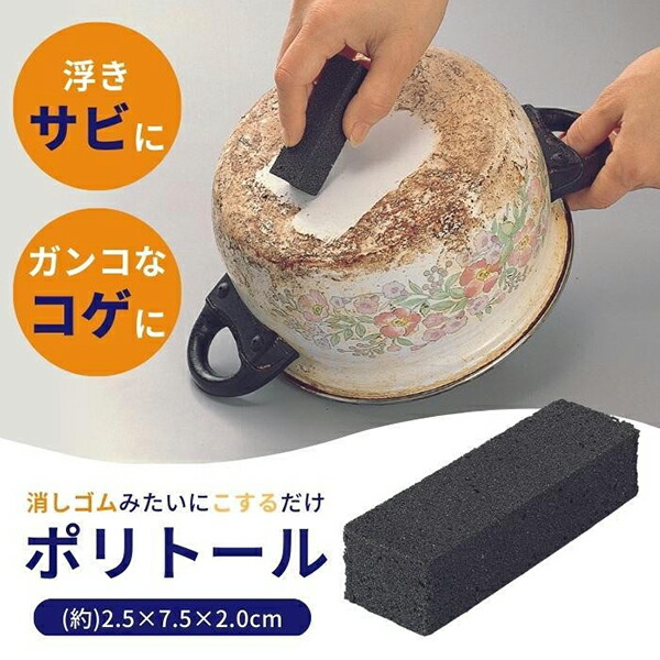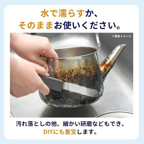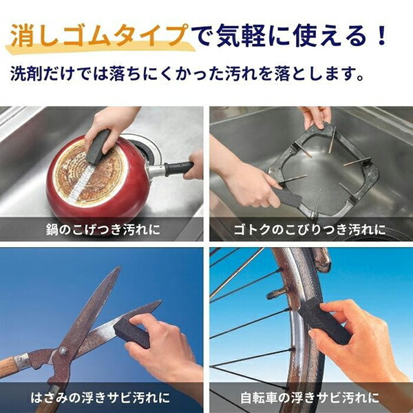 鍋のこげつき汚れ、ゴトクのこびりつき汚れ、ハサミや自転車の浮きサビ汚れを落とします。水で濡らすか、そのままお使いください。汚れ落としのほか、細かい研磨などもできDIYにも重宝します。消しゴムタイプで気軽に使えます。