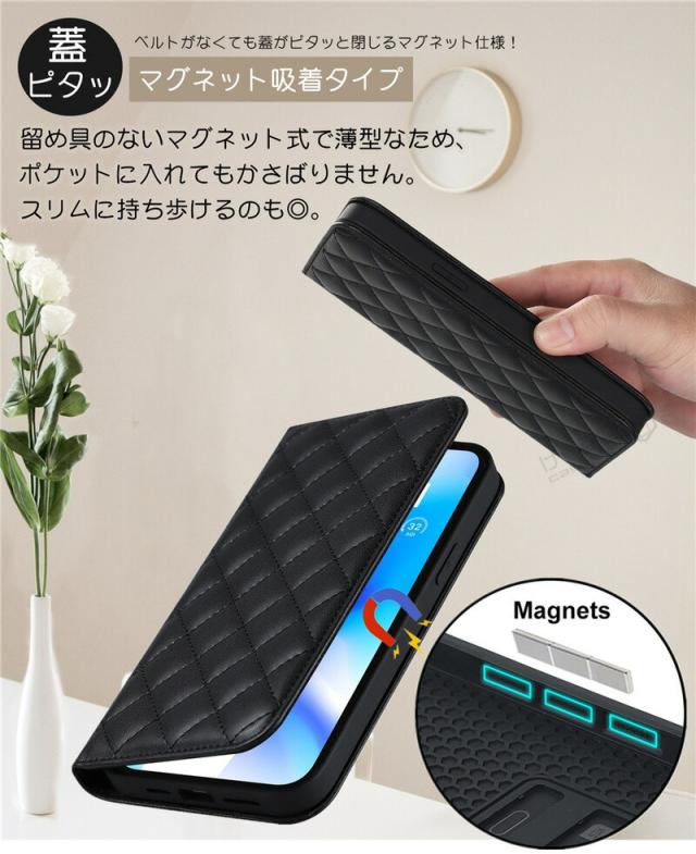 ベルト無しのシンプルなデザインでありながら、スマートフォンにしっかりフィットする高品質で高級感溢れるの手帳型スマホケースです。