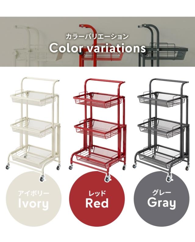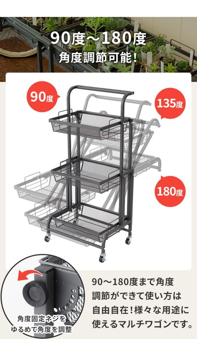 | キッチン・リビングの収納はもちろん観葉植物や工具収納......使い方自由自在のマルチワゴン。 通気性の良いメッシュ素材のカゴが3段あり収納力も抜群!カゴは外して持ち運びもできます。 角度調節ネジをゆるめ、本体の取っ手を上下に動かせば角度調節可能。 キャスター付で移動も楽々、取っ手もありスムーズに動かせます。 |