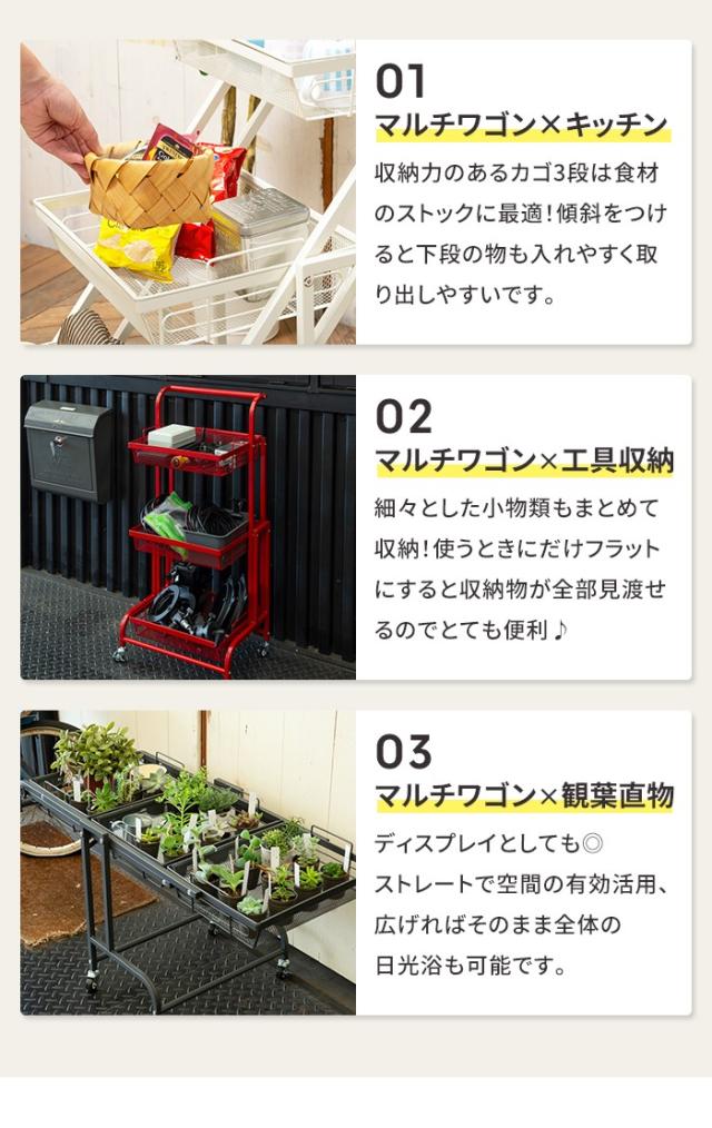 キッチン・リビングの収納はもちろん観葉植物や工具収納......使い方自由自在のマルチワゴン。