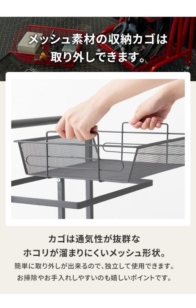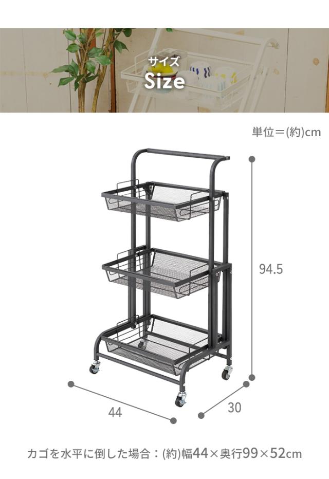 通気性の良いメッシュ素材のカゴが3段あり収納力も抜群!カゴは外して持ち運びもできます。