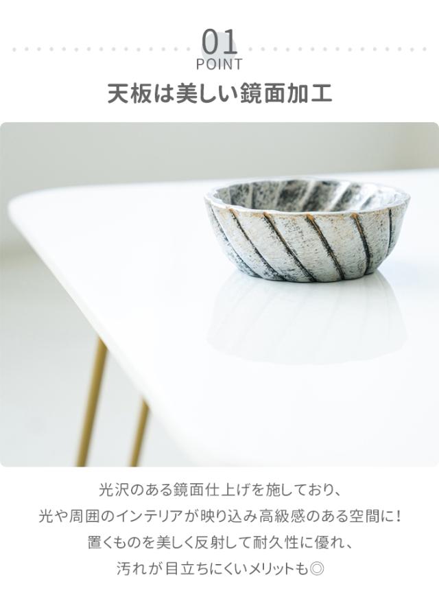 光沢のある鏡面仕上げを施しており、光や周囲のインテリアが映り込み高級感のある空間に。脚部のゴールド系カラーもインテリアの差し色になるポイント!
