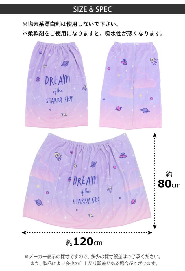 お着換えが楽しくなる、ポップなイラストの巻きタオル。ゴムとスナップボタンが付いているのでスカートやポンチョのようにして使用でき、ジムやお風呂上りや水泳の後などのお着替えにさっと巻けて便利です♪ 学校のプールやレジャーでの水遊びに大活躍。