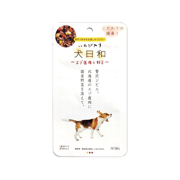 | 検索用文言 | 【犬日和】レトルト エゾ鹿肉と野菜 60g (犬用 ドッグフード ウェット) (わんわん 国産 贅沢ジビエ) (いぬ イヌ dog) |
