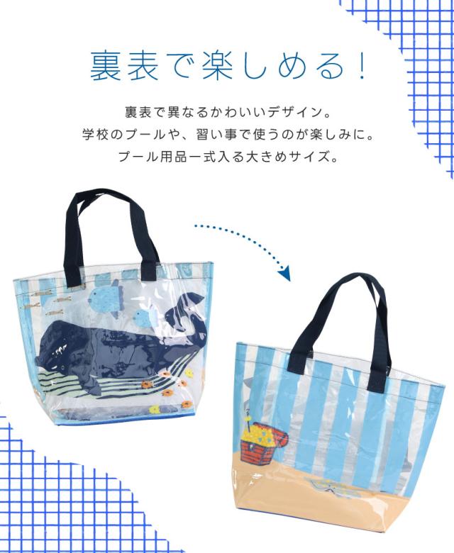 前後で変わるデザイン!早く使いたくなる、かわいいプールバッグ。プール用品が一式入り、内ポケットも付いた大きめサイズ。名前が書けるネームタグが2つついてます。大きく開いてたっぷり入るトート型だから、子どもでも出し入れラクラク。学校や習い事でのプール・レジャーはもちろん、保育園や幼稚園での汚れ物入れとしてもおすすめです。