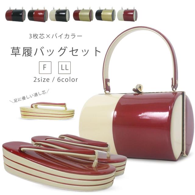 振袖 厚底草履 バッグ セット 3枚芯 光沢が美しい バイカラー 選べる 6色 2サイズ ペラ入りで高級感アップ フリーサイズ LLサイズ 2石鼻緒 合皮 艶あり 結婚式 結納 卒業式 入学式 振袖 袴 24cm 25cm 26cm やや大きめ