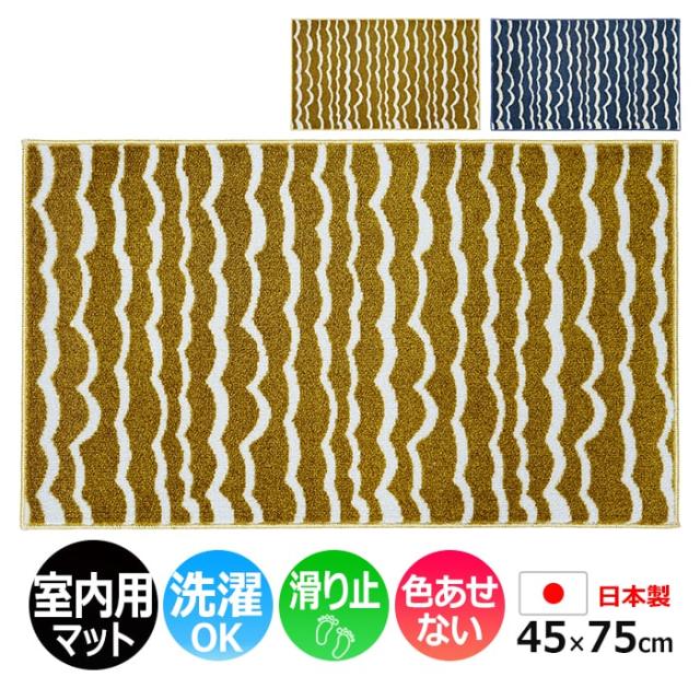 玄関マット 室内 おしゃれ 北欧 洗える マット キッチン 室内 屋内用 約 45×75cm 北欧 かわいい Tomoko Murata Ripple (R) リップル (さざ波) シンプル ブルー ゴールド 紺 ボーダー 滑り止め付き フロアマット 日本製 裏面不織布 洗面所 脱衣所 引っ越し 新生活