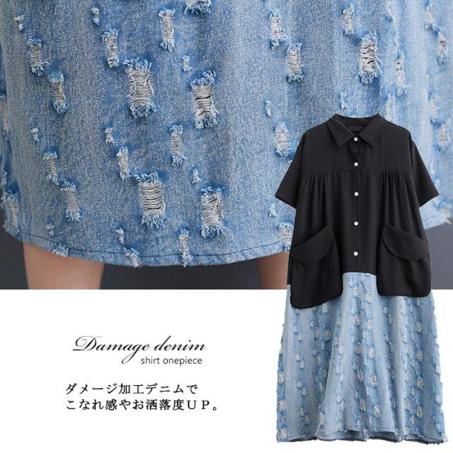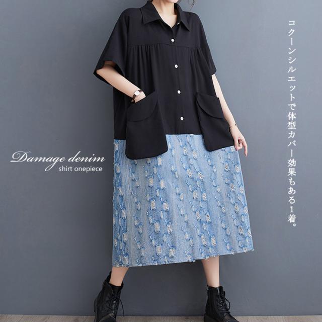 大きいサイズ レディース ドッキングワンピース デニム切替ワンピ オーバーサイズ 異素材 半袖 夏 (249109)