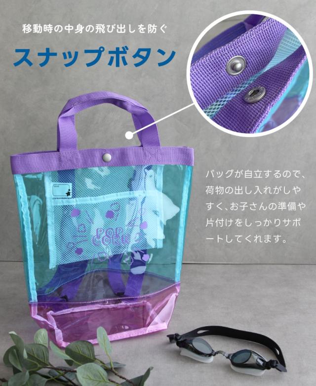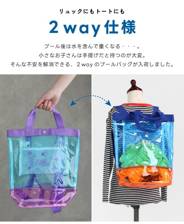 トートにもリュックにもなる2wayプールバッグ!クリアな配色が早く使いたくなる、かわいいデザイン。プール用品が一式入り、内ポケットも付いた大きめサイズ。名前が書けるネームタグがついているので、学校や習い事にもぴったり。バッグが自立するから、子どもでも出し入れラクラク。学校や習い事でのプール・レジャーはもちろん、保育園や幼稚園での汚れ物入れとしてもおすすめです。