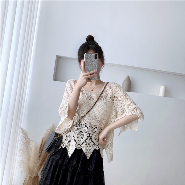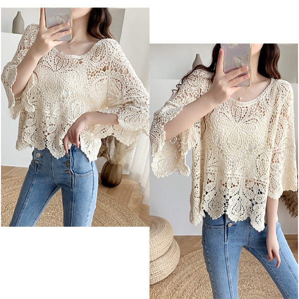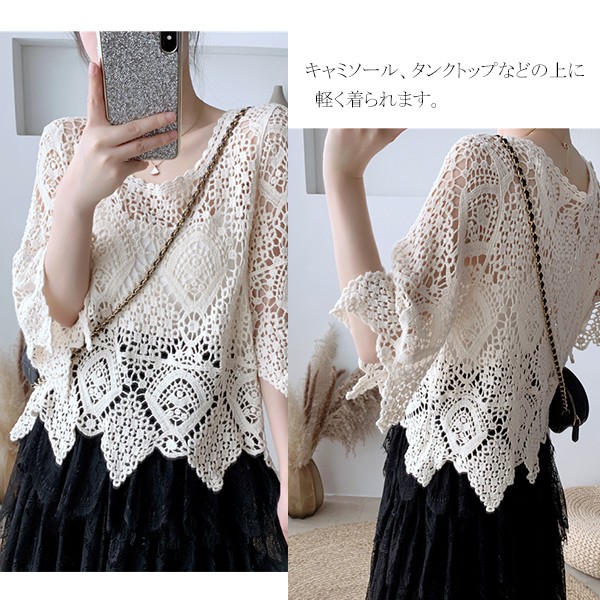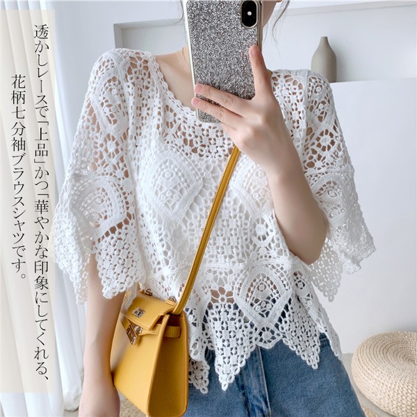 ブラウス レディース クロシェ編みレース風プルオーバー トップス レース プルオーバー トップス Tシャツ 透かし編み スカラップ 手編み風 韓国 ゆったり おしゃれ 7分袖 日焼け対策 冷房対策 冷え性対策 着やせ きれいめ おしゃれ シンプル 着痩せ かわいい
