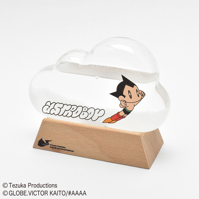 10万馬力を携えた心優しいロボット少年が雲を超え空高く飛んでいくそんな勇気ある姿を、雲形ストームグラスにドッキングした素敵なデザインとなりました。