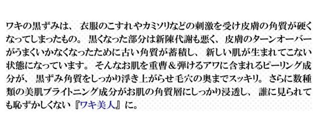 | 使用方法 | 週に1〜2回を目安に、適量(1〜2プッシュ)を手に取りワキなど身体の気になる部分に塗布してください。 お肌の上で泡状に変化し始めてから1〜2分おいたあと、水またはぬるま湯で十分に洗い流してください。 |