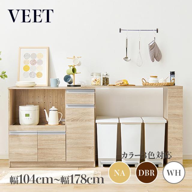 VEET 伸縮キッチンカウンター ナチュラル 全3色 幅104〜178×奥行40×高さ84cm 収納棚付きテーブル カウンター 組み立て商品 キッチン収納 ごみ箱上ラック キッチンボード 作業台