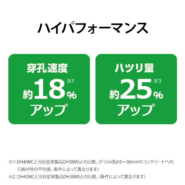 従来機(DH38MS)と比べ穿孔速度が18%、ハツリ量が25%アップ