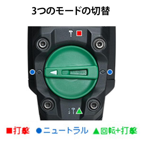 大形化した切替レバーを本体上面に配置し、視認性をよくすることで、「打撃」「ニュートラル」「回転+打撃」の3つのモードの切替がスムーズに行えます。