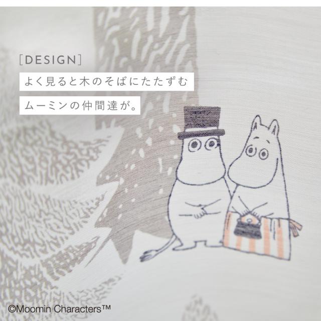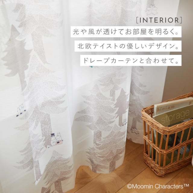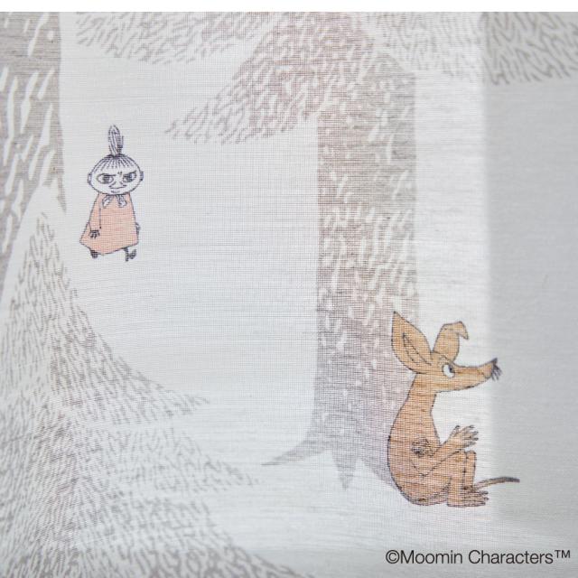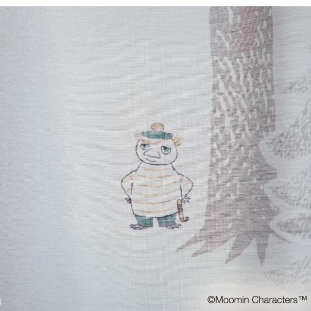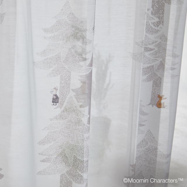 リズミカルに縦に配置された木々、森で暮らすムーミンと仲間たち。お部屋がムーミン谷の様になる、癒されシアーカーテン。