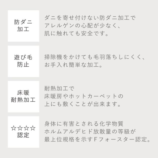 ■備考:防ダニ加工、耐熱加工(床暖房、ホットカーペット対応)、遊び毛防止