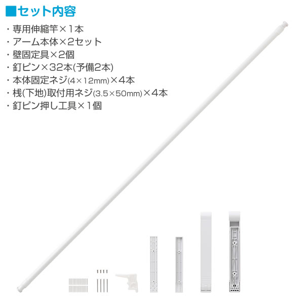 セット内容専用伸縮竿×1本、アーム本体×2セット、壁固定具×2個、釘ピン×32本(予備2本)、本体固定ネジ(4×12mm)×4本、桟(下地)取付用ネジ(3.5×50mm)×4本、釘ピン押し工具×1個