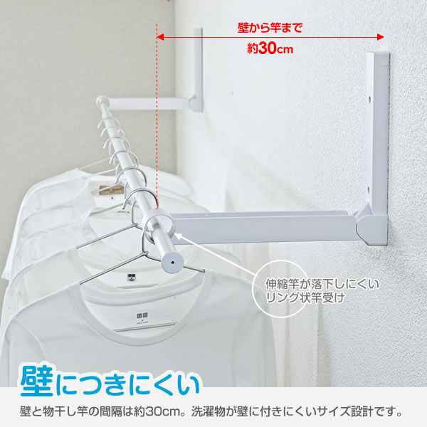 壁から竿までの間隔は約30cm。洗濯物が壁につきにくいサイズ設計です。