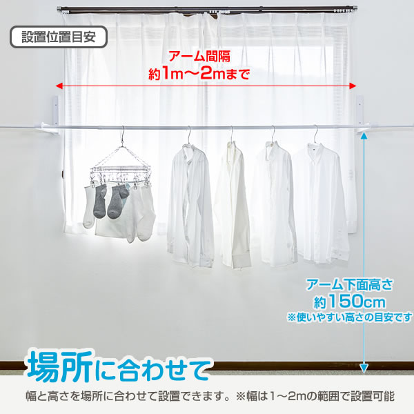 物干竿は伸縮式。約1〜2mの範囲で取り付け可能です。