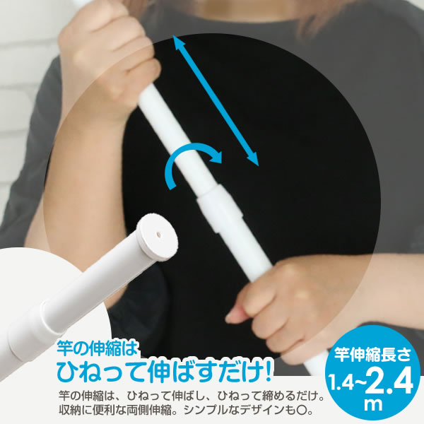 サイズ(約):伸縮竿/直径2.2cm・1.9cm×長さ1.4〜2.4m アーム部品/(本体収納時)幅4×奥行4×高さ30cm