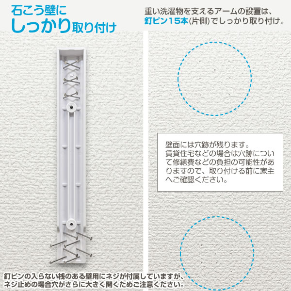 しっかり取り付け石膏ボード壁に竿受けを取り付け、物干し竿を渡して使用します。ネジまたは釘ピンでしっかり取り付け。(釘ピン止めの場合/片側15本使用 ネジ止めの場合/片側2本使用)