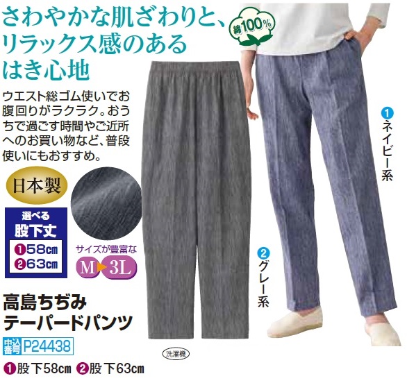 春夏 日本製 高島ちぢみテーパードパンツ 全2色 選べる股下丈 コットン テーパードパンツ レディース 婦人服 ミセス シニア 女性 ネイビー グレー センタープレス ウエストゴム 縮み織り ズボン ファッション 40代 50代 60代 70代 80代 母の日 お母さん 春服 夏服 長ズボン 春物 夏物 裾上げ済み イージーパンツ
