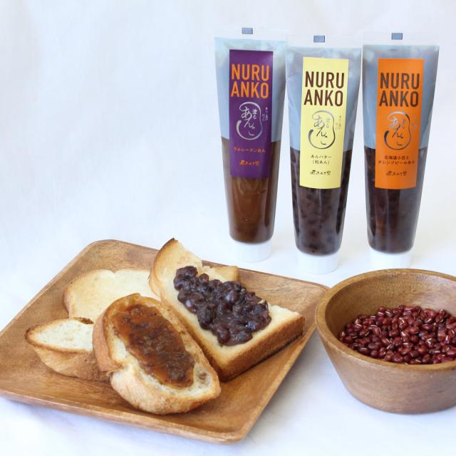 【数量・内容】NURU ANKO(北海道産小豆とオレンジピールあん、ラムレーズンあん、あんバター(粒あん))各140g×1