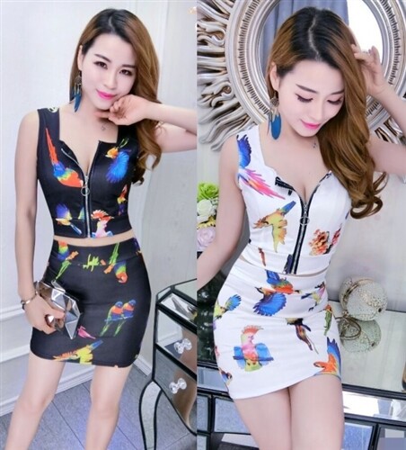 ミニドレス キャバドレス キャバワンピ オシャレな鳥柄トップス&スカートセット 2ピースセットアップ ミニドレス セクシードレス