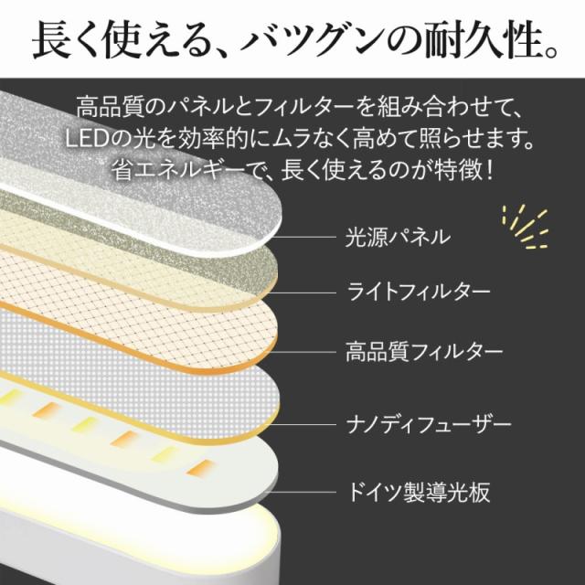 高品質のパネルとフィルターを組み合わせて、LEDの光を効率的にムラなく高めて照らせます。