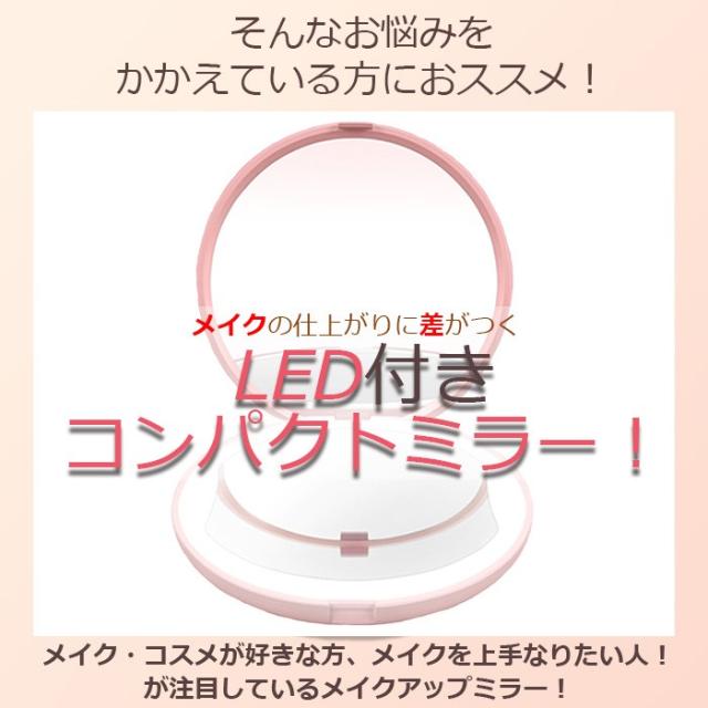 | 商品の説明 | いま大人気のLED照明付きコンパクトミラー。 いつでもどこでもキレイを。 メイクの仕上がりは照明に左右される メイクの仕上がりに差がつく!LED付きコンパクトミラー ●ポイント1: 自然光に近い照明 12個のLEDライト付き LEDが埋め込まれたミラーライトは演出性が高く、メイクアップが自然な仕上がりになり、最適 裏面のスイッチでライト照明ON ●ポイント2: 拡大鏡 映る部分が大きく見えます。 拡大鏡を使うと細部まで見えるので毛穴カバーなど微調整が必要なメイクが簡単に。 等倍鏡で顔全体のメイクバランスを確認できます。 ・手軽にコンパクト 軽くてコンパクトだから外出や旅行の持ち運びにとっても便利。 ・充電の心配なし ボタン電池使用でいつでもライトON ・カラーバリエーション ピンク-優しい雰囲気でかわいいカラー ホワイト-さわやかで清潔感のあるカラー |