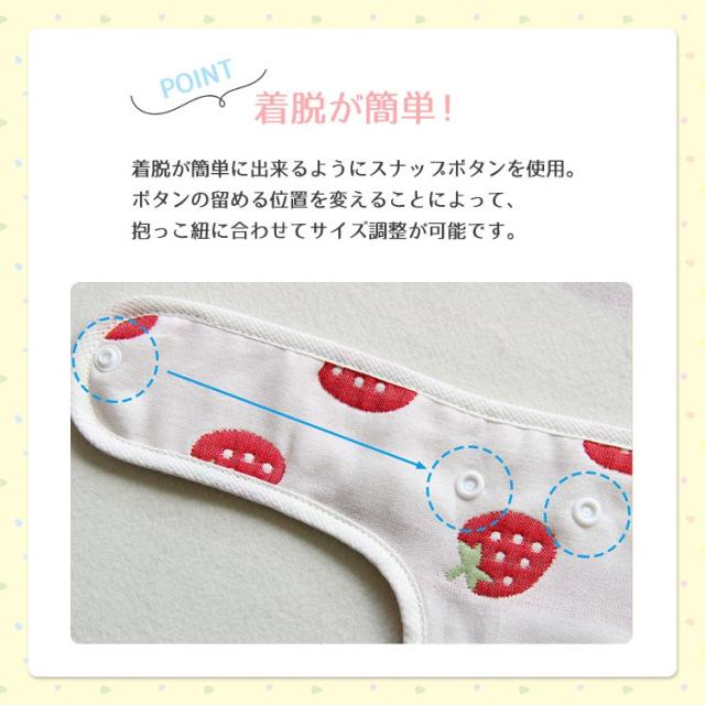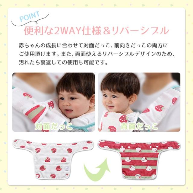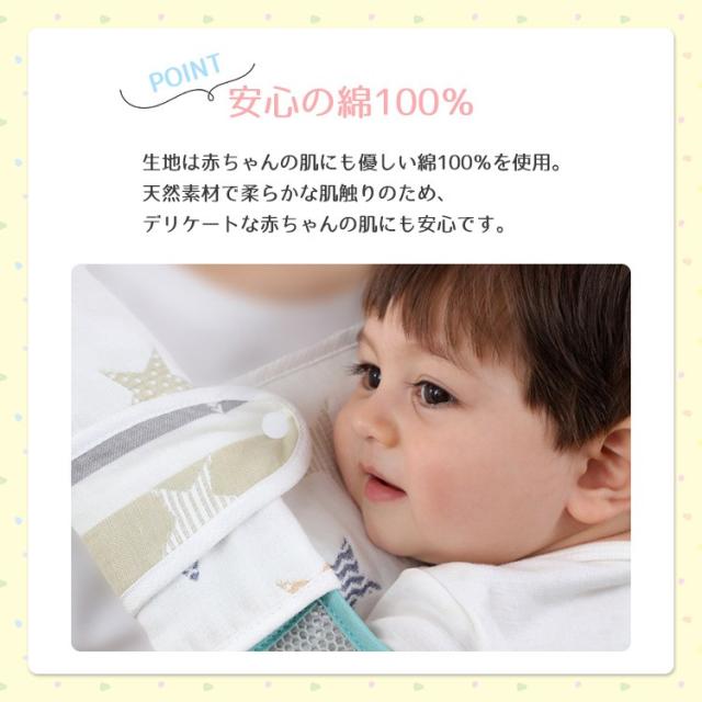 | 商品の説明 | 綿100%、6重ガーゼ構造で吸水性・速乾性抜群の抱っこ紐用のよだれカバーです。 天然素材の柔らかで肌触りの良い生地で、 デリケートな赤ちゃんの肌にも安心してお使い頂けます。 赤ちゃんのよだれや汗をしっかり吸収し素早く乾くので快適に過ごせます。 ボタンで簡単に着脱ができ、ボタンの位置で抱っこ紐の幅に合わせて調整が可能。 リバーシブルなデザインなので、汚れたら裏返して使うことも出来ます。 胸当てパッド付きで、赤ちゃんの成長に合わせて対面だっこはもちろん、前向き抱っこにも対応しています。 抱っこ紐の他、ベビーカーやチャイルドシートのベルトのカバーに、 ショルダーバッグやリュックサック、マザーズバッグにつけるのもおすすめです。 |