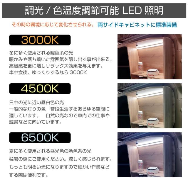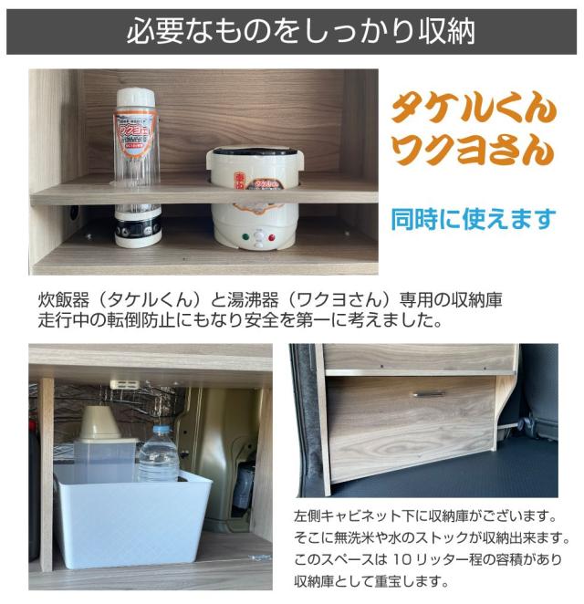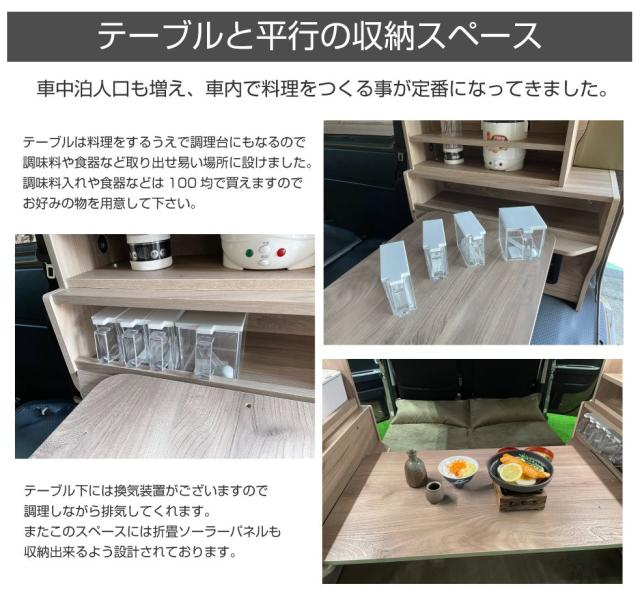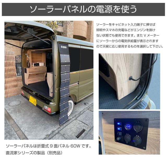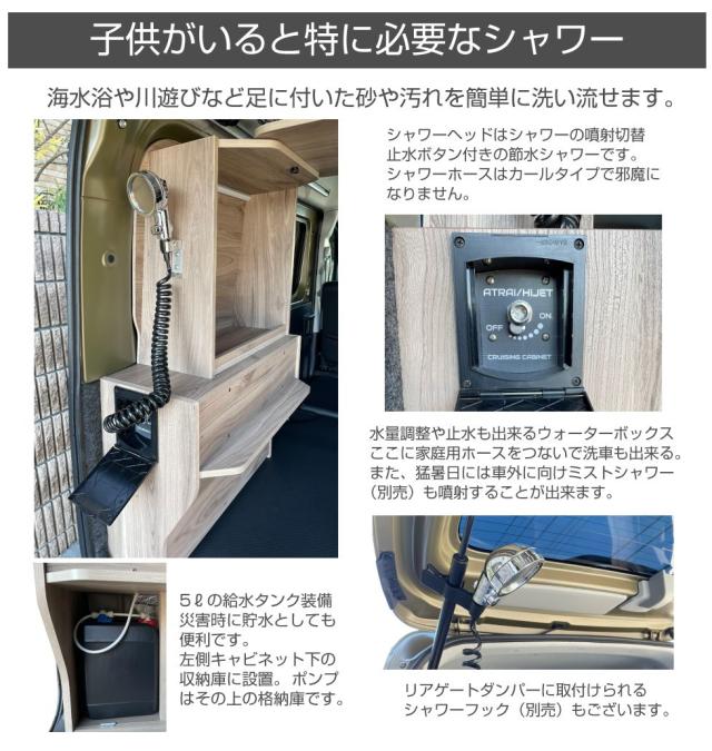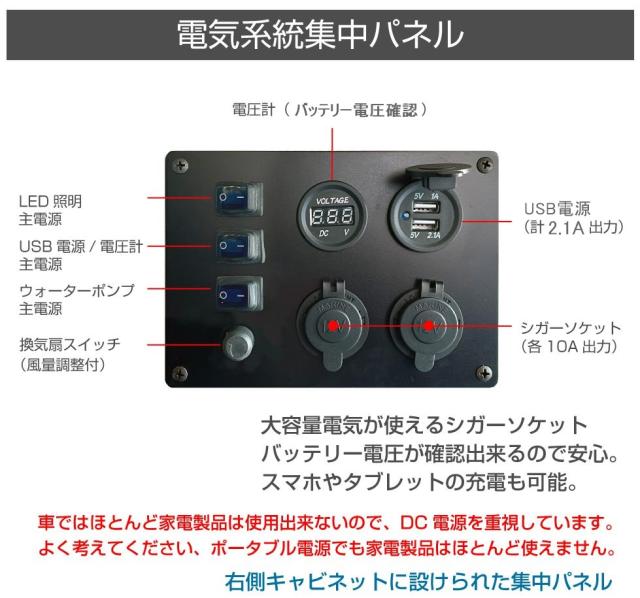 ・DC12V換気扇 ・電圧計 ・USB電源(2.1A) ・DC12Vシガーソケット(10A)×2 ・LED照明(運転席側・助手席側) ・外部入力(ミツルくん用) ・外部シャワー |